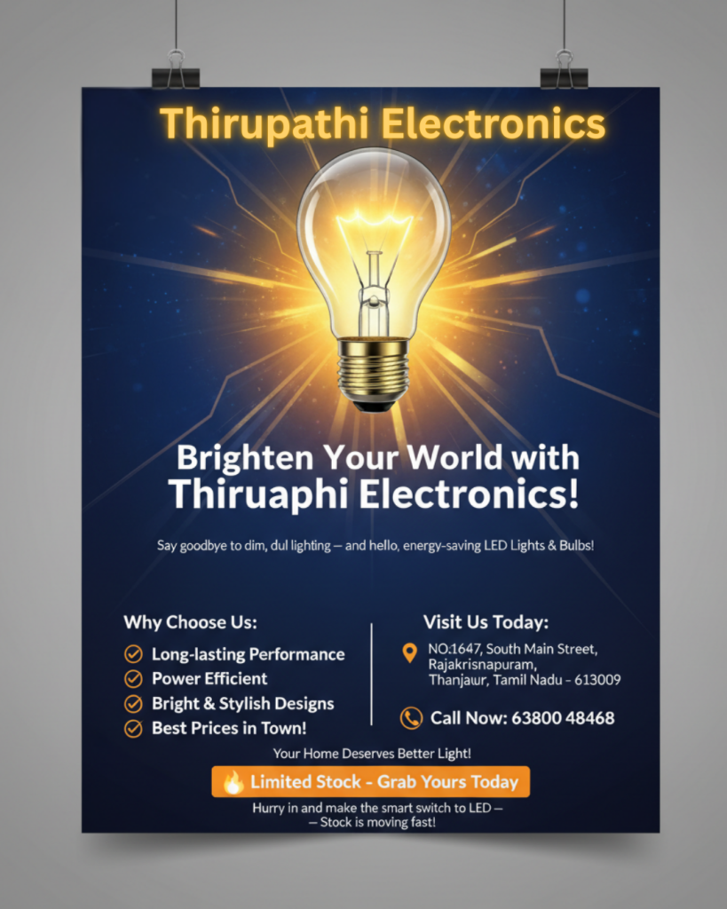 Welcome to Thirupathi Electronics, Thanjavur’s most trusted destination for high-quality electronics, appliances, and accessories. Whether you’re upgrading your lighting, enhancing your home setup, or exploring the latest tech, we’ve got everything you need — all under one roof!